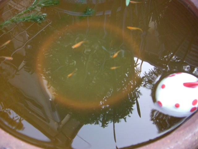 庭先のビオトーブ?睡蓮鉢ではメダカ(楊貴妃)が動き始めました。