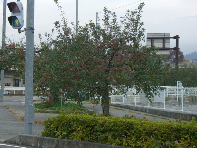 中央道飯田インターを出ると歩道にはりんごの木。