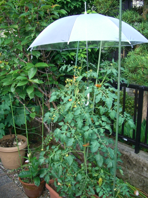 プランターの雨降りの移動は大変なので 傘をさしています。