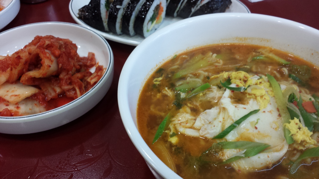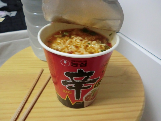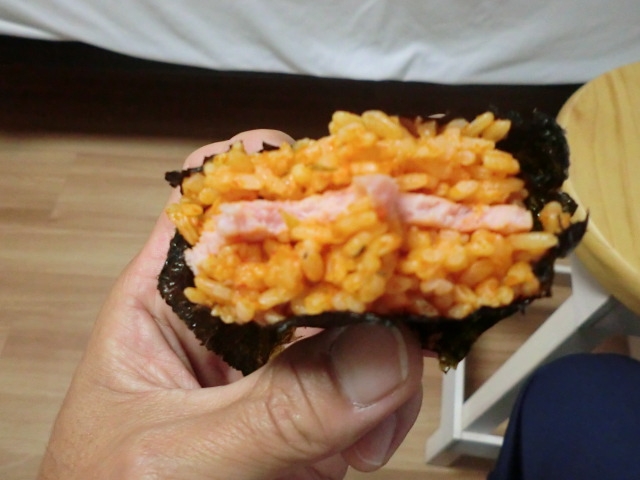 キムチ味のスパムをはさんだおにぎりと 辛ラーメンで空腹を満たしいよいよ始動。
